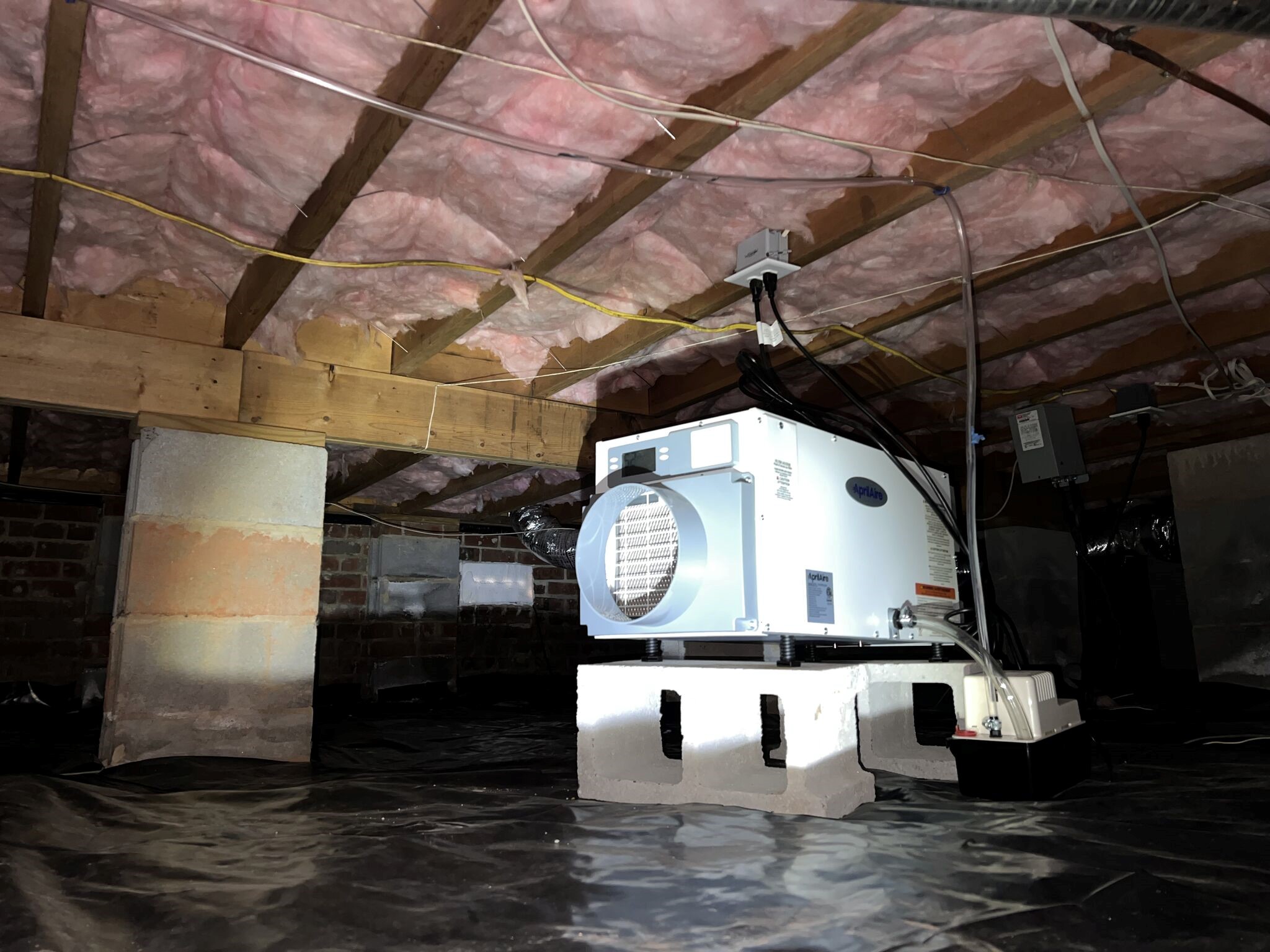 A crawl space can pull a surprising amount of moisture from the ground. Even when there is no standing water, water vapor moves upward and raises humidity. We installed a 10 mil vapor barrier across the crawl space floor to reduce that moisture load. The liner was laid to provide continuous coverage, with careful attention to overlaps, seams, and transitions around piers and edges. The result is a cleaner surface that resists tears better than thinner plastics and provides a more dependable long term moisture defense. - Added an AprilAire E70 dehumidifierCrawl space encapsulation reduces moisture entry, but humidity control finishes the job. We installed a crawl space dehumidifier AprilAire E70 to actively manage relative humidity in the crawl space. The unit was mounted securely on elevated support blocks and positioned to promote steady airflow. In the completed setup, the dehumidifier provides ongoing moisture control and helps keep the space stable through seasonal changes. In the photos, the system is operating and the display shows a set point in the low 50 percent range, which is a common target for crawl spaces to discourage condensation and microbial growth.