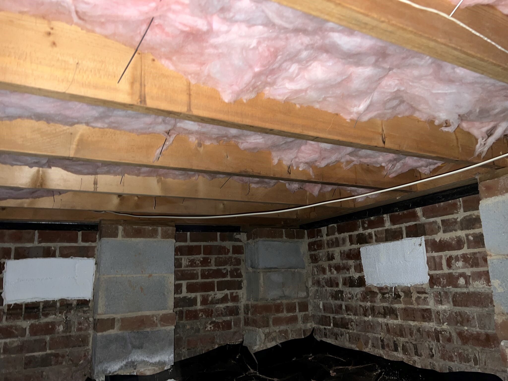 The crawl space had exposed masonry surfaces and floor areas where moisture could evaporate into the air. The insulation between the floor framing was present but not uniformly supported. In crawl spaces, even small gaps or drooping batts can lead to cold spots, energy loss, and higher risk of condensation on framing.